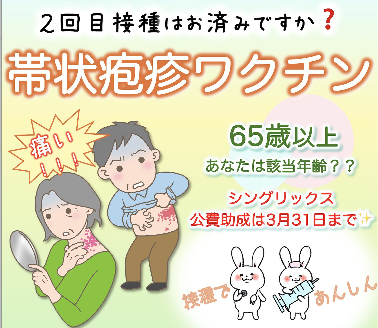 ・上記のご年齢の方で、昨年度に、シングリックス1回目を接種された方でも、定期接種として2回目を受けることができます